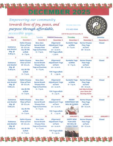 March 13, 14 and 15 at the Barn Abbey in New Harmony, IN. Join yoga teachers Gabrial, Bob, Tami and others for a weekend of getting away to find solace and peace. The time spent here on yourself will do wonders for your life! There will be day passes as well for those that can only attend one day of the retreat. Food by caterer, 'The Moveable Feast' is outstanding! For more information, see the Events tab located at the top of the 'home' page.